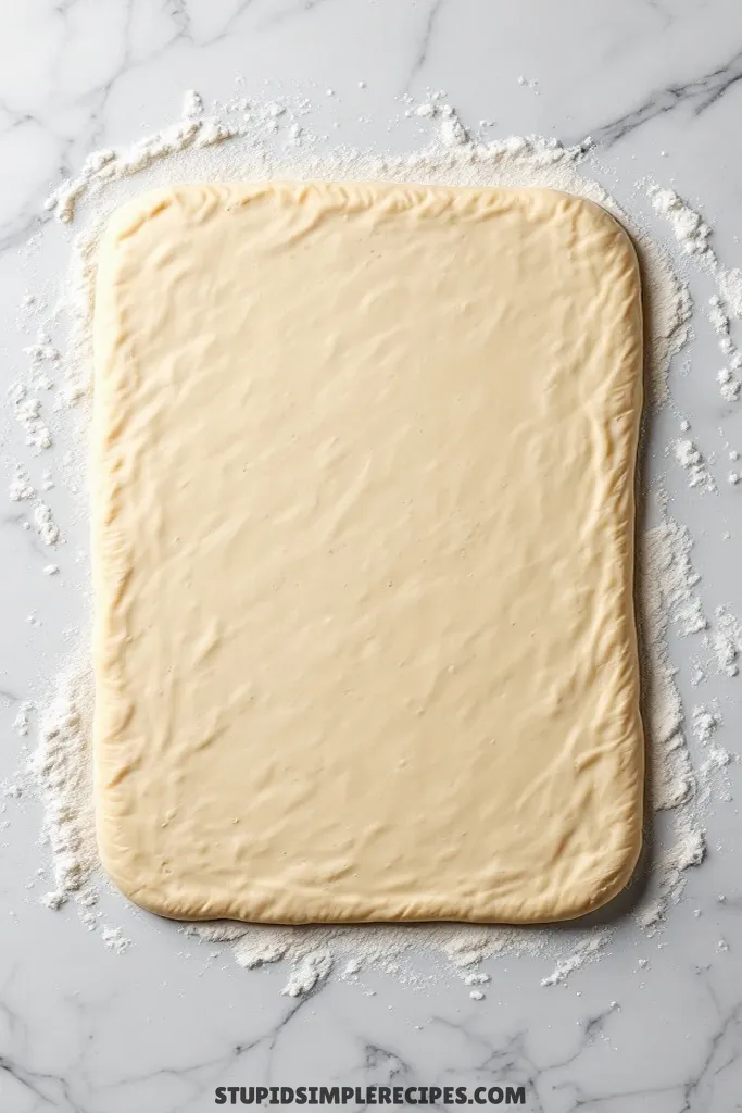- After the dough has doubled, punch it down (literally just push your fist into the center) and roll it out on a floured surface into a roughly 18×12 inch rectangle. Don’t worry about perfect edges – we’ll fix those later.