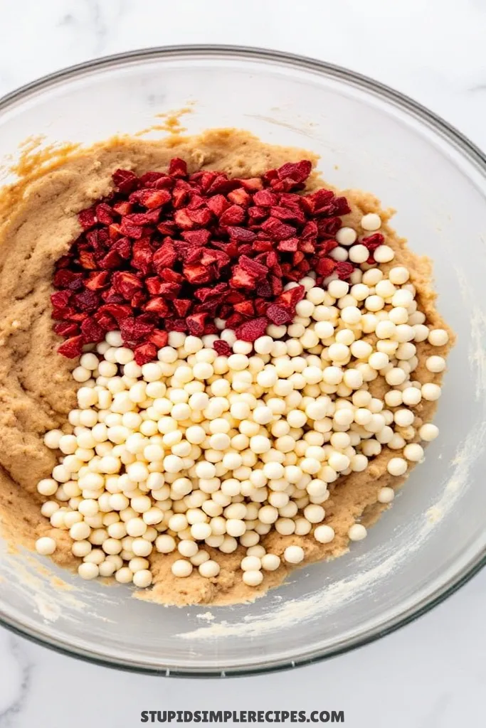 - Gently fold in the white chocolate chips. For the strawberries, crush them lightly in your hands as you add them – you want pieces about the size of raisins, not powder. Some small crumbs are fine though – they’ll give a nice pink swirl to the dough.