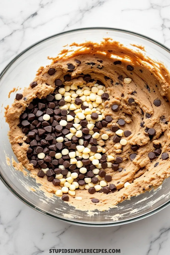 - Now for the fun part – stir in all three types of chocolate chunks by hand. I like to save a few chunks to press into the tops of the cookies later – it makes them look extra tempting.